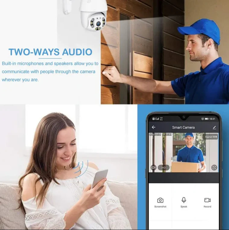 - Comunicare bidirecțională: Poți vorbi și asculta prin camera datorită microfonului și difuzorului integrate.